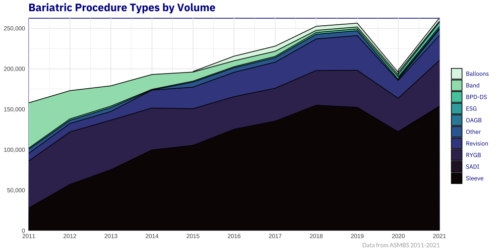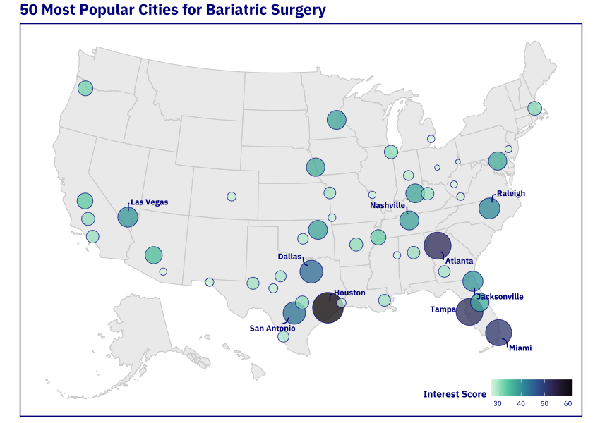 Methodology: Rankings of the 50 states and top 50 metro areas by combining provider per capita, search popularity, and obesity risk. Search popularity used Google Trends data for a year, also and collated by State or City geography. Interest scores were the normalized average of the surgeons per capita, obesity risk, search volume, and search popularity. Each metric contributed a maximum of 25 points. Detailed data on performed medical procedures is regulated by federal law.